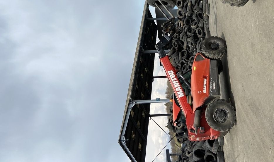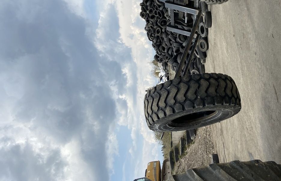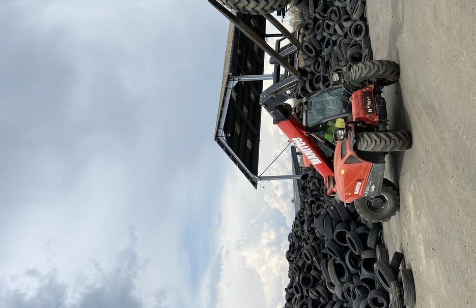 Il charge des pneumatiques à l’aide d’une pelle à chenilles avec grappin et les pèse.