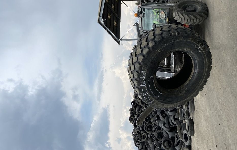 Il charge des pneumatiques à l’aide d’une pelle à chenilles avec grappin et les pèse.